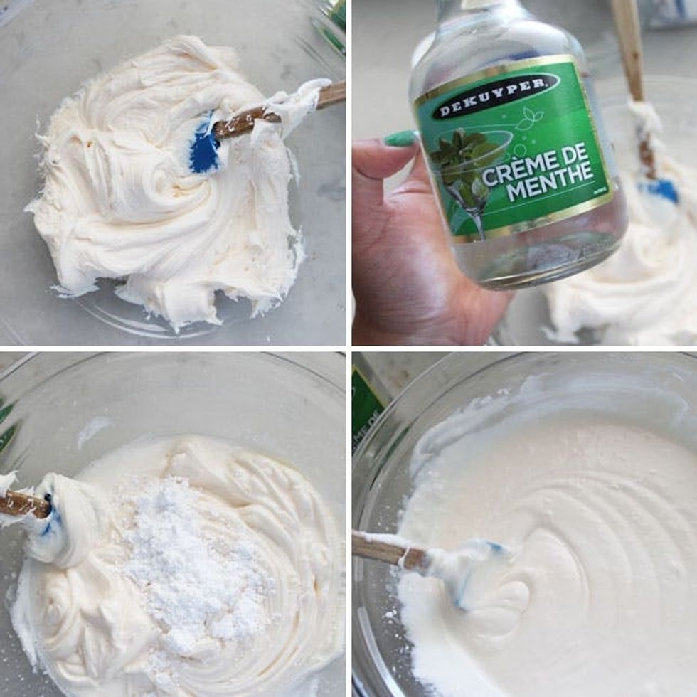 In a mixing bowl, combine frosting, 4-6 ounces of creme de menthe, and 1/4 cup of powdered sugar. We recommend pouring the creme de menthe in one shot at a time to make sure your frosting doesn’t become too runny. No matter what, your frosting will be closer to icing in texture, and less thick than regular frosting.