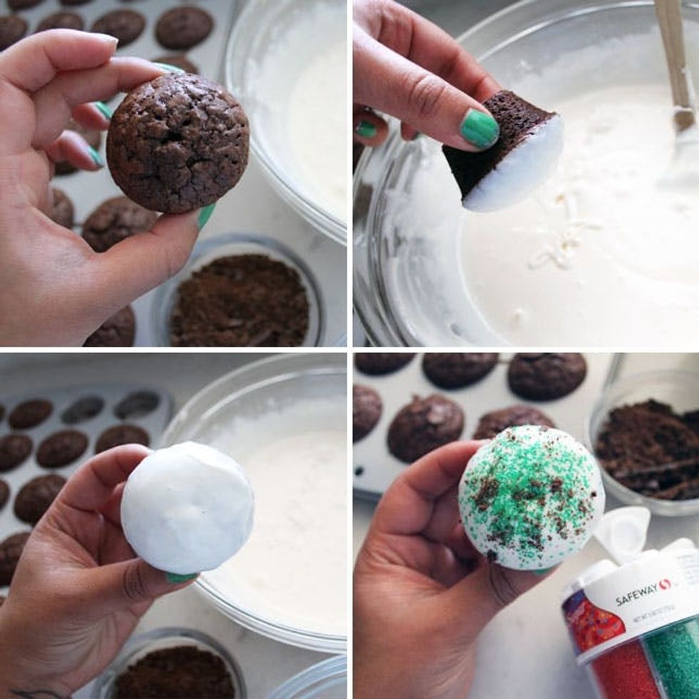 To frost, dunk the top of your brownie in the frosting. Top with green sprinkles and extra Thin Mints crumbs if you have them.