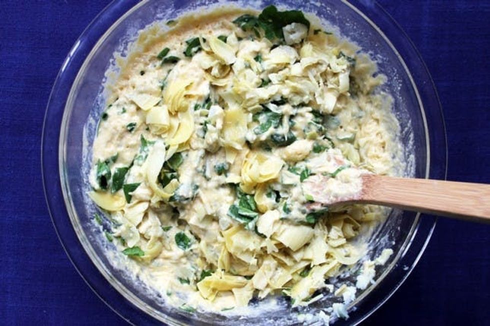 Chop up spinach and artichokes. You can also use a food processor or Magic Bullet to get things really well-diced.