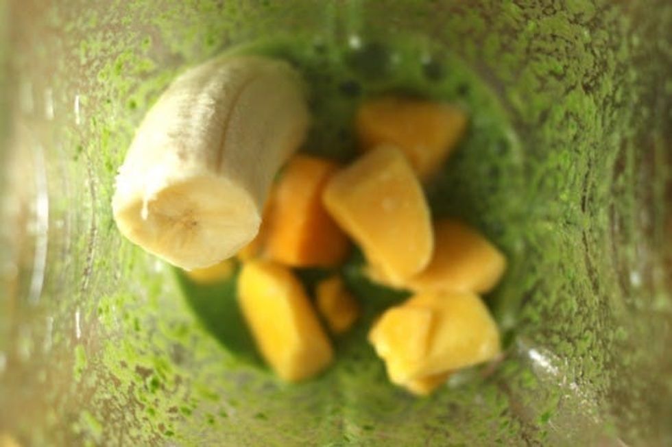 Add the frozen mango chunks and banana. Blend again until smooth.