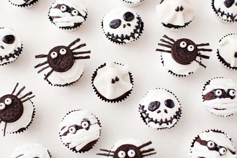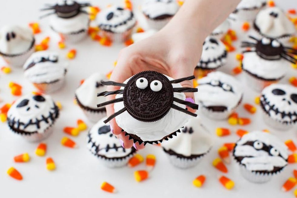 To make the spider cupcakes, frost your cupcake with fluffy white frosting. Cut your licorice into 1 1/2-inch pieces to make spider legs. Twist open your Oreo and press 4 “legs” into the filling on each side of the cookie. Replace the top of the Oreo. With frosting, attach two eyes on top of each cookie. Place your spider on top of your cupcake.