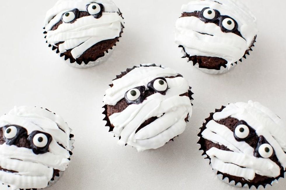 To make the mummy cupcakes, use the decorating icing to pipe long bands across your cupcake. Pipe two triangles in the center of the cupcake with black gel. Place a candy eyeball on top of each triangle.
