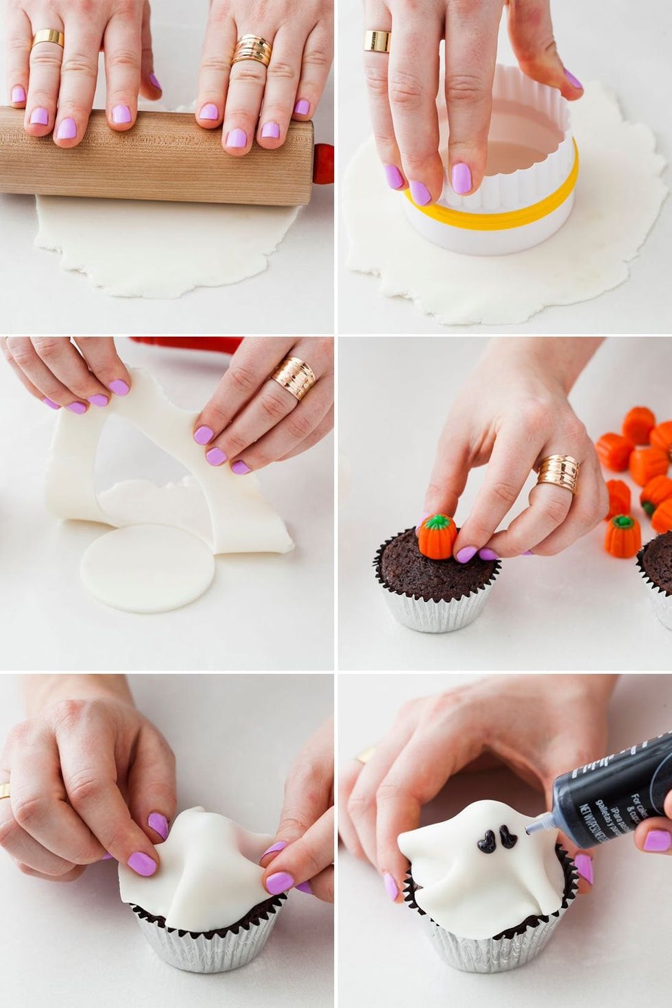 To make the ghost cupcakes, roll out a ball of white fondant. Cut into 4-inch rounds. Place a piece of round candy (or a small marshmallow) on top of your cupcake. Drape a fondant round over the candy. Pipe eyes onto your ghost with black gel.