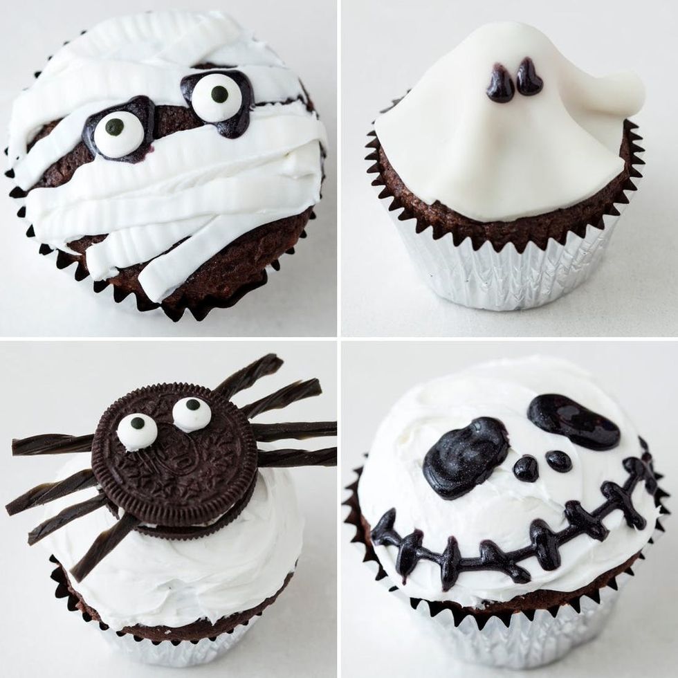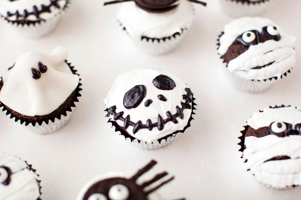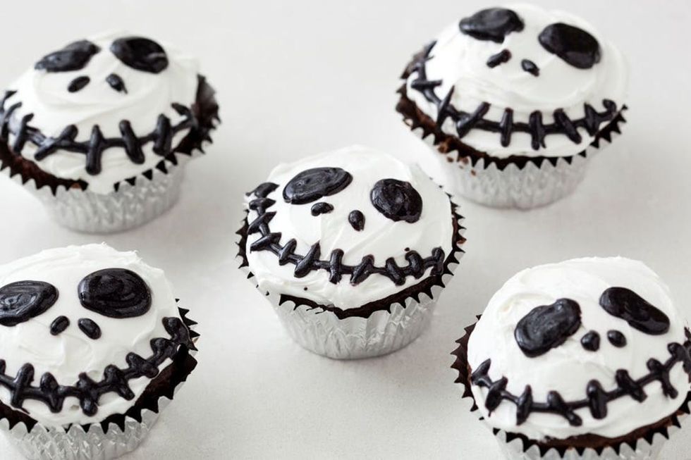 4. To make the Jack Skellington cupcakes, frost your cupcake with fluffy white frosting. Use the black gel to pipe two large eyes. Next, pipe on two short lines for a nose. Finally, pipe a long line across the bottom of your cupcake for a mouth. Add icing barbs to make his ghoulish grin.