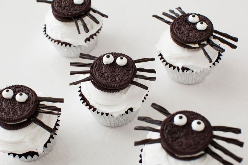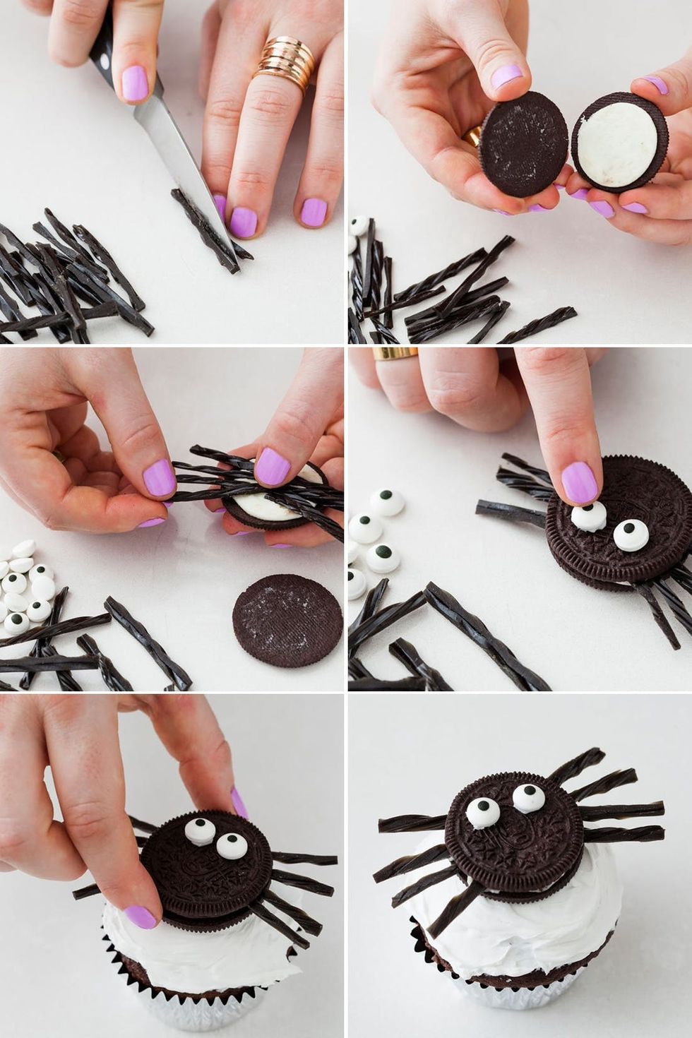 5. To make the spider cupcakes, frost your cupcake with fluffy white frosting. Cut your licorice into 1 1/2-inch pieces to make spider legs. Twist open your Oreo and press 4 “legs” into the filling on each side of the cookie. Replace the top of the Oreo. With frosting, attach two eyes on top of each cookie. Place your spider on top of your cupcake.