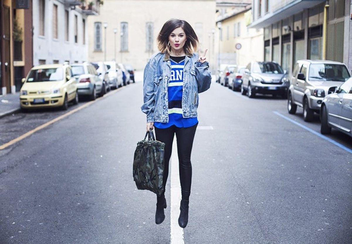 17. Vintage Varsity Vixen: Style a worn-in denim jacket with a football or hockey jersey and sleek skinny jeans for a sporty-girl vibe. (via Daria Daria)