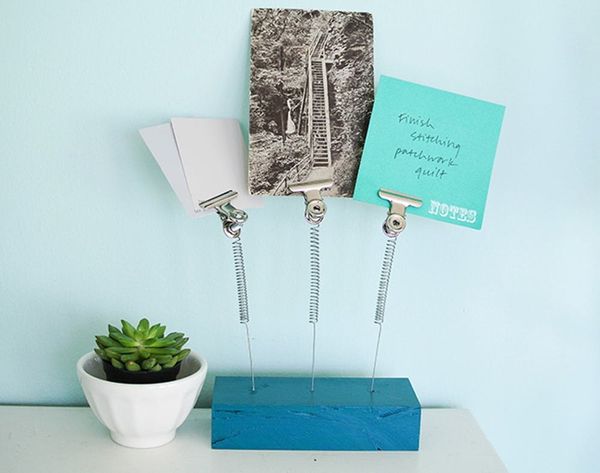 Pick all of these materials up at your local hardware store, and be sure to save the receipt. Why? ‘Cause you’ll find you only spent about $15 for everything you need to make this spring clip holder yourself. DIY FTW! Lay everything out on your workspace, then drill holes in your wood block where you’d like the springs to go. They can be in any pattern you like—zig zag, in a cluster, or in a straight line, like we did. Next, make your clip contraptions by screwing your clip to your spring, and securing it with a hex nut. Finally, snip the curve off of your spring, and pull it so that the springs widen ever so slightly.