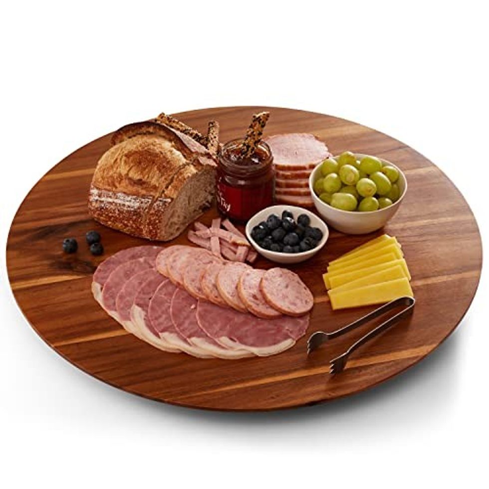 Avoid having to make a large reach across the table for the food item you want when you have the wooden lazy Susan to do the job for you. It spins around so everyone has a chance to get some bread and cheese.