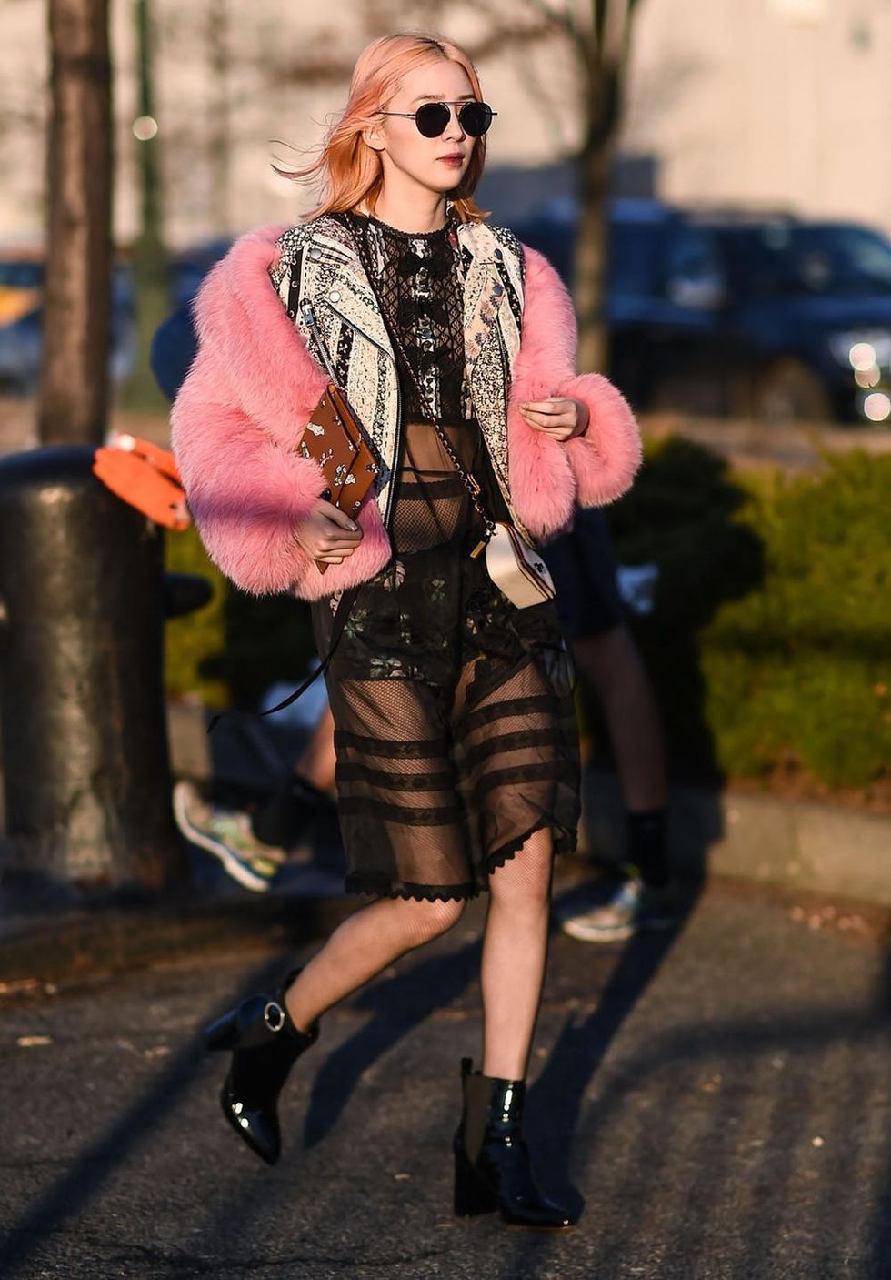 3. Bold and Bright: Don’t be afraid to integrate a bold pop of color into your outfit with a neon pink number. Fuzzy statement coats complement patterned jackets and play well with mesh dresses and patent ankle boots too. (Photo via Daniel Zuchnik/Getty Images)