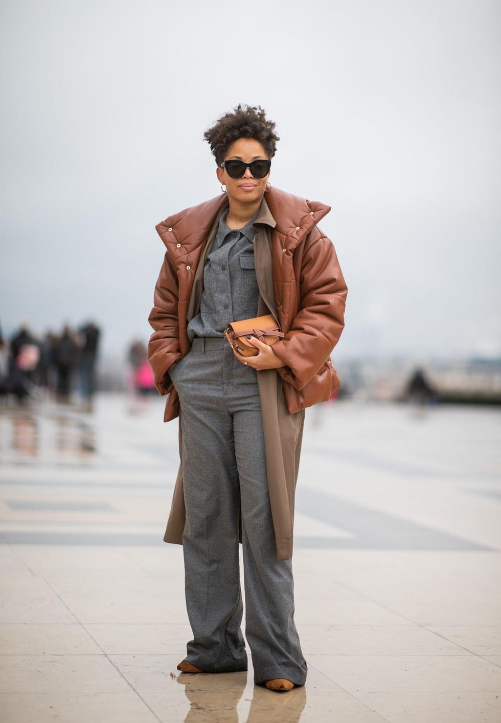 6. Au Naturel: This year is all about the neutrals. Try a traditionally standalone, two-piece suit and up the ante with a long topcoat under a puffer. Pair with camel shoes, a muted clutch, and gold hoops (obvi). (Photo via Christian Vierig/Getty Images)