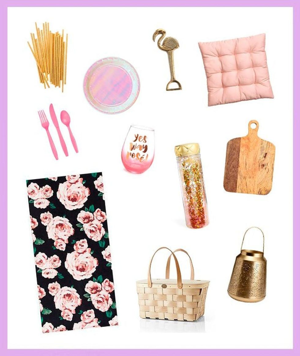 Oh Happy Day Metallic Paper Straws ($6), Oh Happy Day Iridescent Party Plate ($7, set of 12), Zestt Flamingo Bottle Opener ($32), H&M Solid-Color Seat Cushion ($10), H&M Wooden Cutting Board ($13), Slant Collections Insulated Tumbler ($20), H&M Large Metal Candle Holder ($25), Crate and Barrel Leather-Handled Picnic Basket ($70), Bulk Party Zone Candy Pink Premium Plastic Cutlery Sets ($14, set of 96), Slant Collections Yes Way Rosé Stemless Wine Glass ($13)