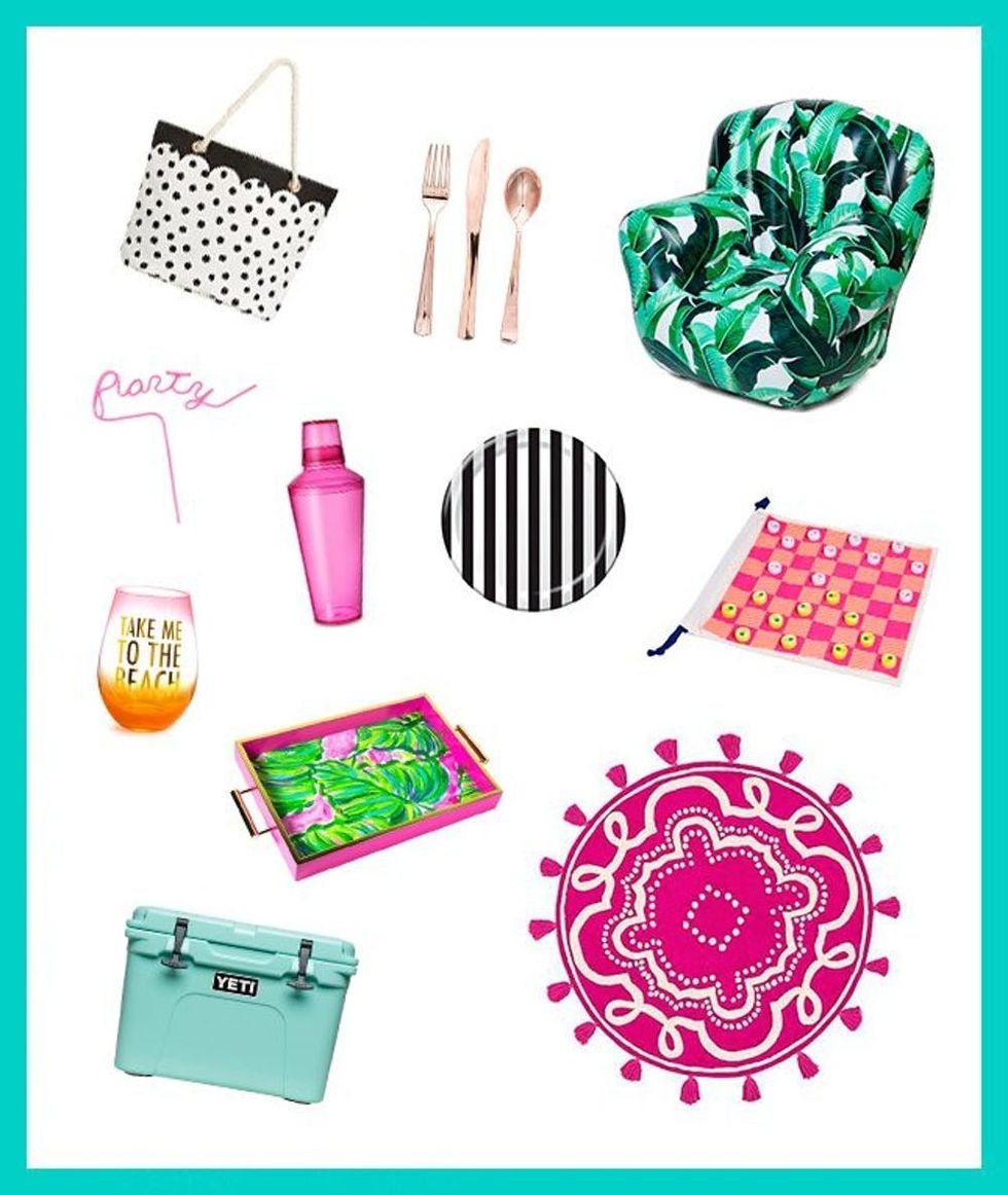 The Emily & Meritt Black/White Dot Rope Beach Tote ($49), Party at Lewis Rose Gold Metallic Plastic Cutlery ($5, set of eight), Sunnylife Inflatable Chair Banana Palm ($56), Sunnylife Travel Backgammon and Checkers ($21), PBteen Lennon & Maisy Tassel Round Rug ($199), Lilly Pulitzer Hostess Tray ($75), Yeti Roadie Cooler ($250), Slant Collections Take Me to the Beach Stemless Wine Glass ($13), Ban.do Pink Party Straw ($10), Direct Shopping Center Pink Plastic Shaker ($13), Spritz Stripe Dinner Plates ($2, set of 10)