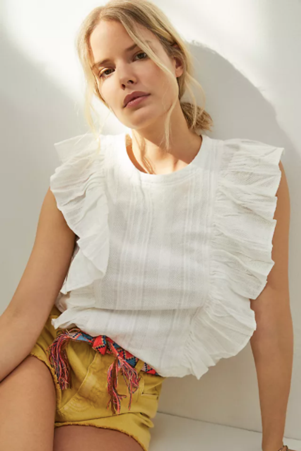Shoulders are having a moment. These gathered flounces will steal the show on your next Zoom call. Also: 100 percent organic and Oeko-Tex certified.
