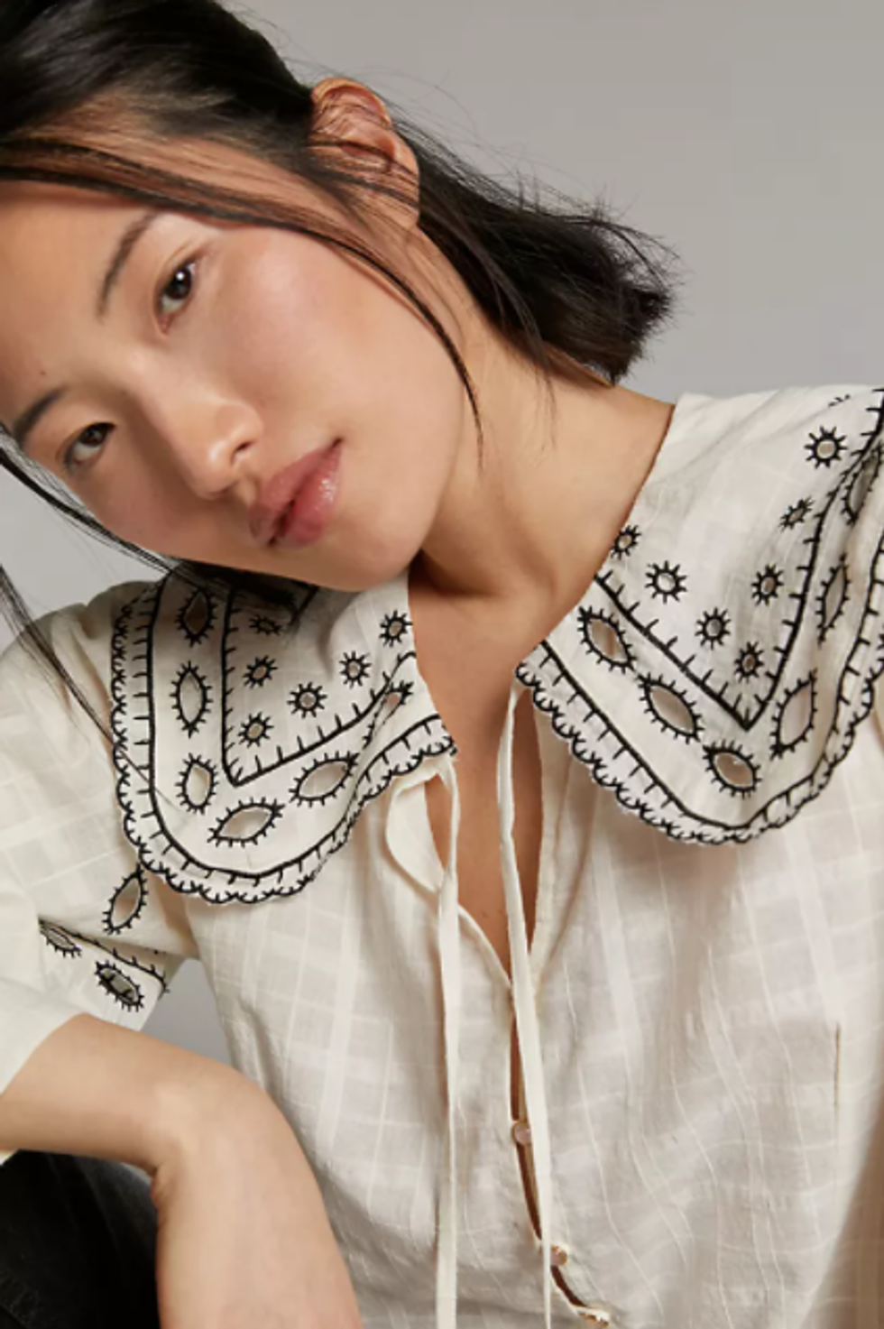 Ruffled trim and intricate embroidery make us feel straight out of a Bridgerton storybook.