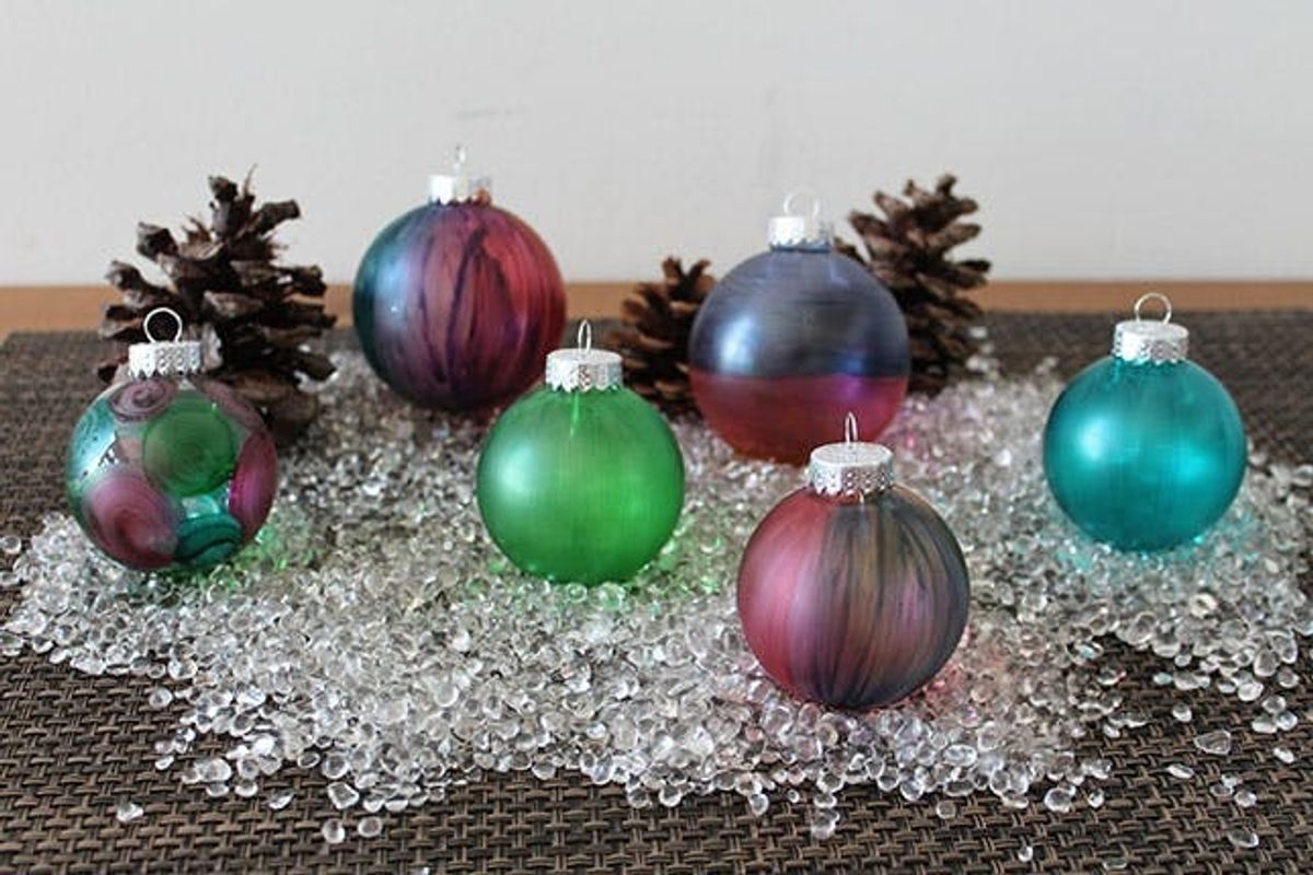 For these rainbow colored ornaments, there’s no need to dilute the glue mixture. You can do stripes, strips or swirls — whatever your heart desires.To get a more dramatic layered look, put on more coats of the non-diluted stain.