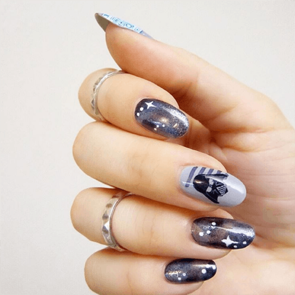 9. Darth Vader: Isn’t this mani cute AF? Switch it up by accenting your nail with a gold Darth Vader decal for a glittery take on this design.