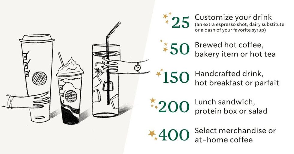 On Starbucks’s current rewards program, you earn two stars for every dollar you spend in a store. Once you’ve earned 125 stars, you can redeem them for a free food or drink menu item of any price point. On the new program, you’ll still earn two stars for every dollar spent, but you can redeem them for items at different values. For example, for only 25 stars, you can get your non-dairy milk alternative for free. 50 stars rewards you a fresh coffee or baked good. Now, it will require 150 stars, not 125, for a handcrafted latte, hot breakfast item, or parfait.