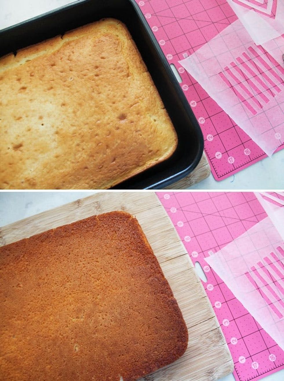 Take the cake out and let cool. Flip onto a cutting board and place in the fridge for 20 minutes.