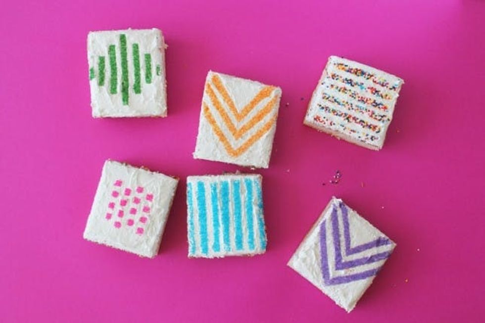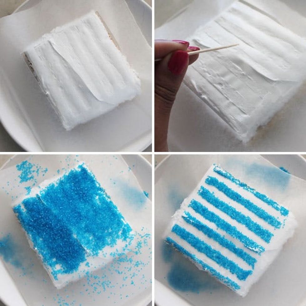 Since you’re working with sprinkles, the need to be totally precise is not so important. We freehanded a chevron pattern, stripes, and little squares (which ended up looking like polka dots).