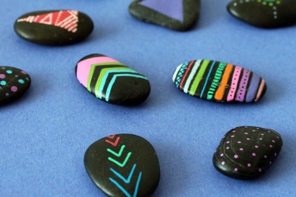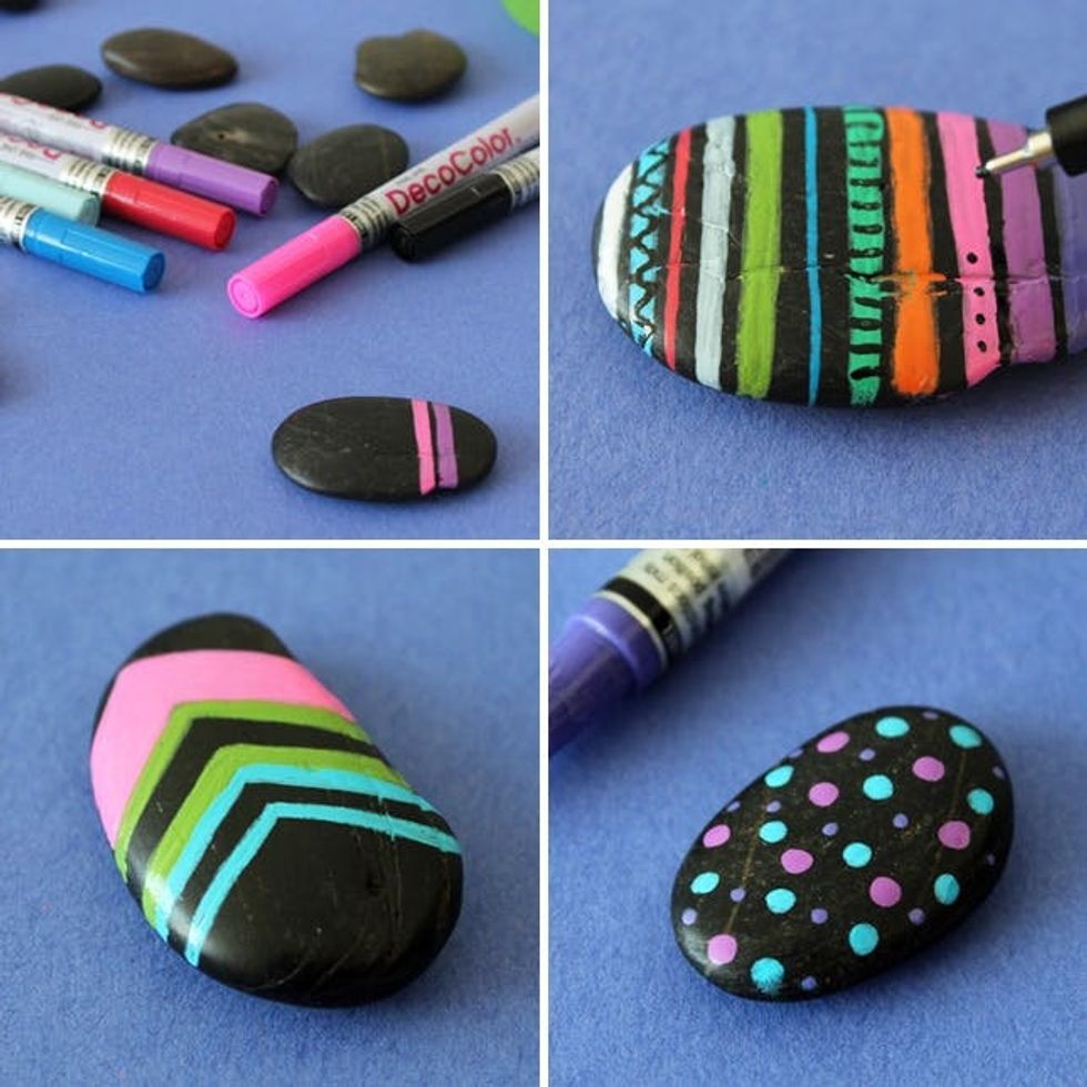 Start with basic patterns like stripes, polka dots, and the ever-present chevron. We love the contrast of the deep black stone with our bright and springy paint pens.