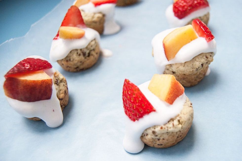 Top each cookie cup with a dollop of coconut whipped cream, and put strawberries and peaches on top!