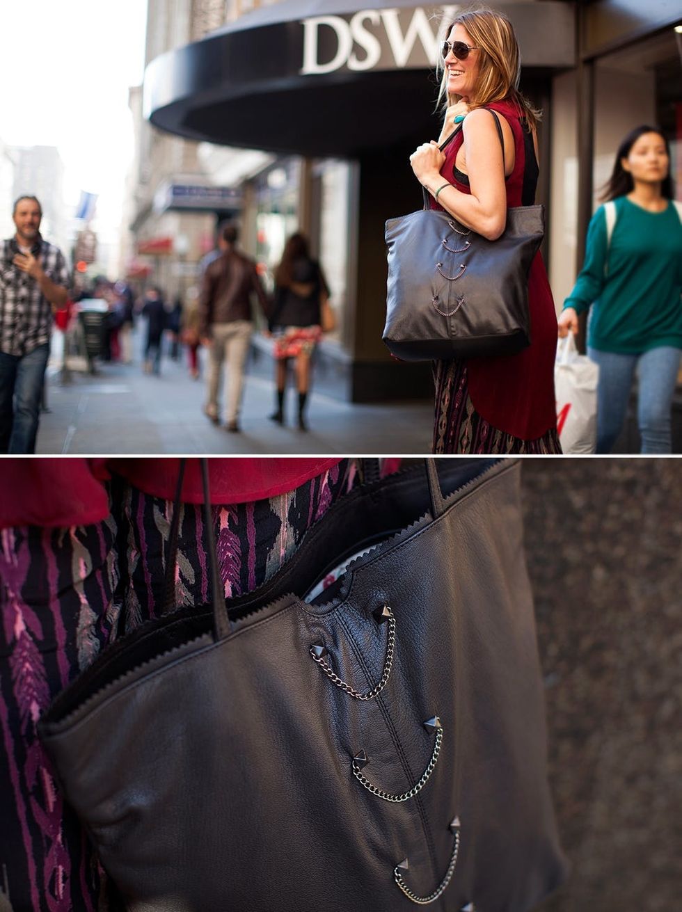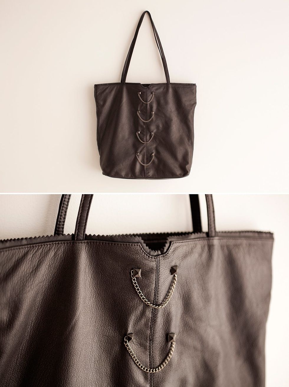 Work your way down the bag, repeating the above steps so that you have a total of four stud/chain embellishments tricking out the center of your bag. We left about three vertical inches between our studs.