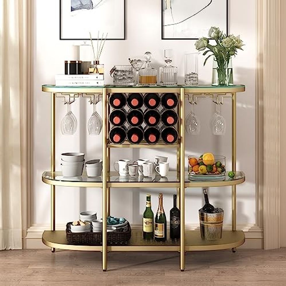 Stop filling your kitchen cabinets with your bar essentials. Create a stylish home bar area with a three-tier bar table. This compact table features multiple levels for storing bottles, glasses, and bar accessories, making it perfect for entertaining guests. Its sleek design and sturdy construction make it an ideal addition to kitchens, dining rooms, or living areas.