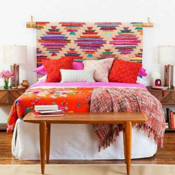 2. DIY Headboard: You have big dreams to travel the world. Create a global-inspired boho bedroom backdrop to help assuage that itch to jet set while you save up. Staple a woven tapestry to your headboard to give it a totally new look. Add a little cushion first, to make it extra cozy. (via Good Housekeeping)