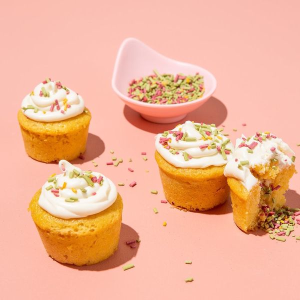 Silpat’s Muffin Mold), and whip up our buttercream frosting (subbing Lakanto for the powdered sugar). When the cupcakes have fully cooled, use a sharp paring knife to cut a little circle out from the center. Fill it with sprinkles, press the cut-out cake back on top of each cupcake, apply the frosting to the top, then garnish with more sprinkles!