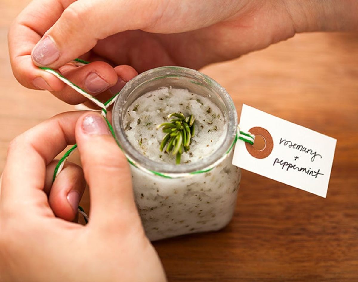 If you want to dress them up for gift giving, you can always label their main ingredients and tie it onto the jar with festive embroidery floss. We used colors that matched our ingredients, like a muted orange string for the pumpkin spice scrub and bright green string for the rosemary and peppermint one.