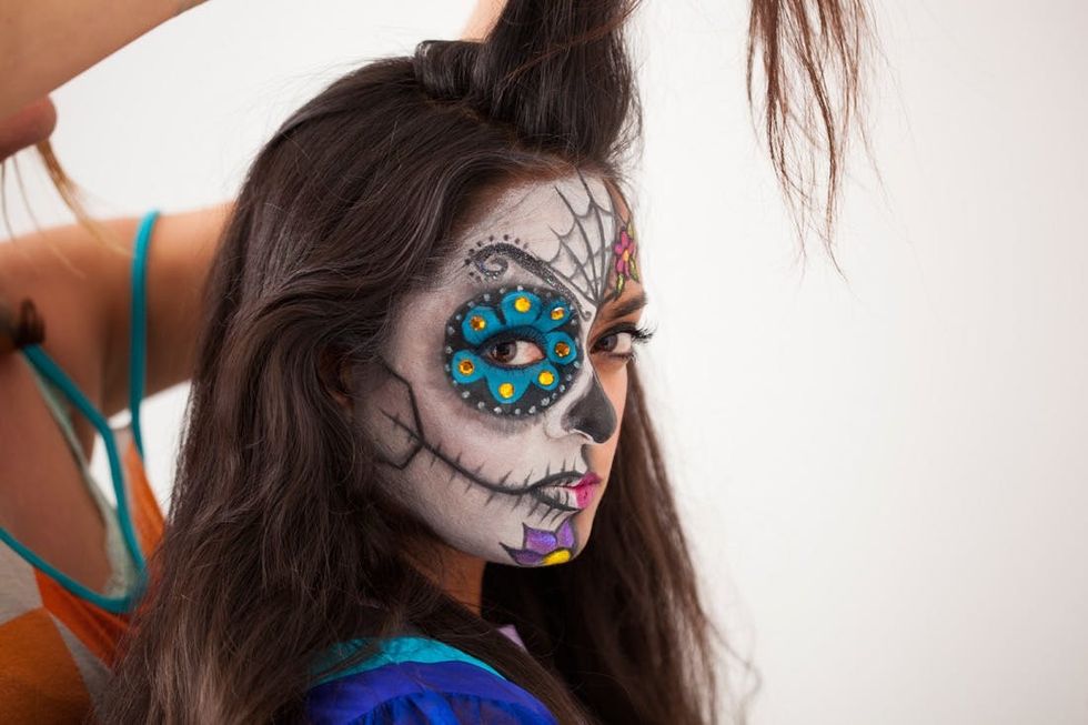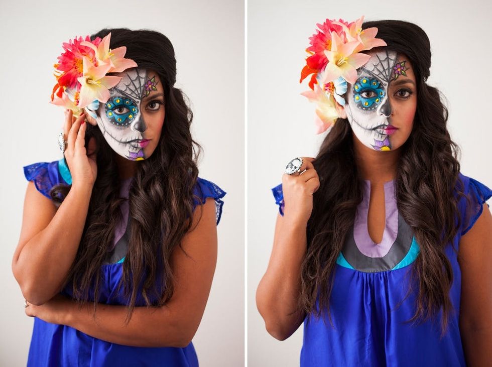 Celebrating Day of the Dead this year? Or thinking of dressing up as a Dia de los Muertos sugar skull for Halloween? Then you’re going to need makeup, face paint, and a few fake flowers. For this Halloween hack, we decided to do a two-face look, with half as the sugar skull and the other half as simply dressed up. By going for the half-face approach, you can avoid being frustrated with trying to get a symmetrical design, and half of you still gets to be the real you ;)