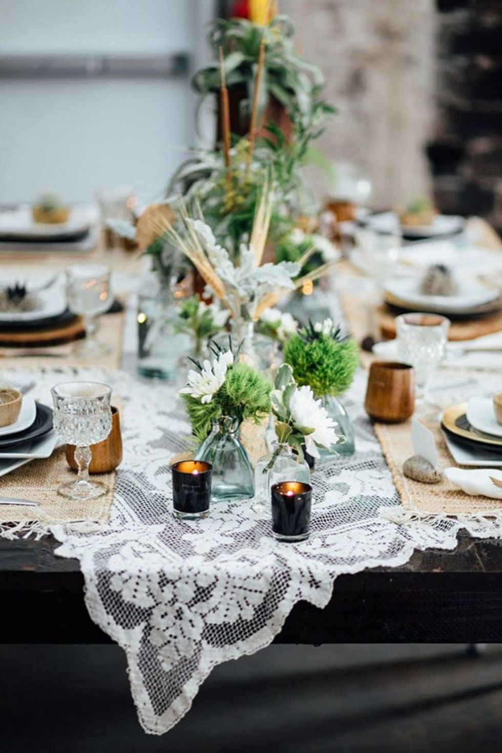 7. Antique-Inspired: You can go vintage without having to dust off old radios and don flapper dresses. Take note from this tablescape’s use of a simple lace runner and sweet, throwback details. Before you know it, you’ll be bringing that antique-chic look to life. (via Monika Gauthier / Ruffled)