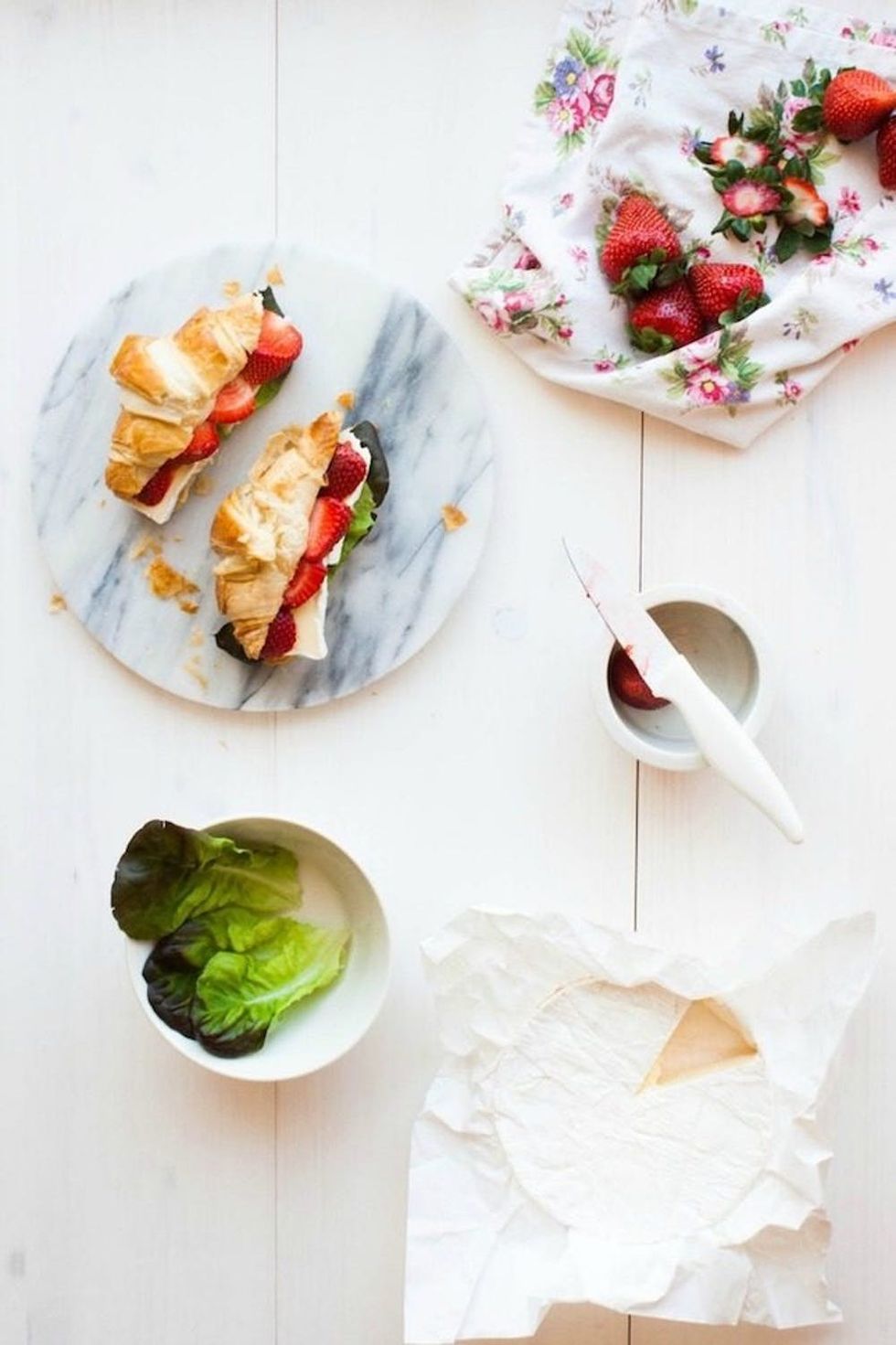 4. Or skip the cooking altogether. If temps in your area are skyrocketing, skip heating up the kitchen. Pick up bagels, schmear, and smoked salmon from a local shop for a DIY bagel bar. Or try these croissant sandwiches filled with Brie and strawberries for an elegant no-cook option. (Recipe via My Blue & White Kitchen)