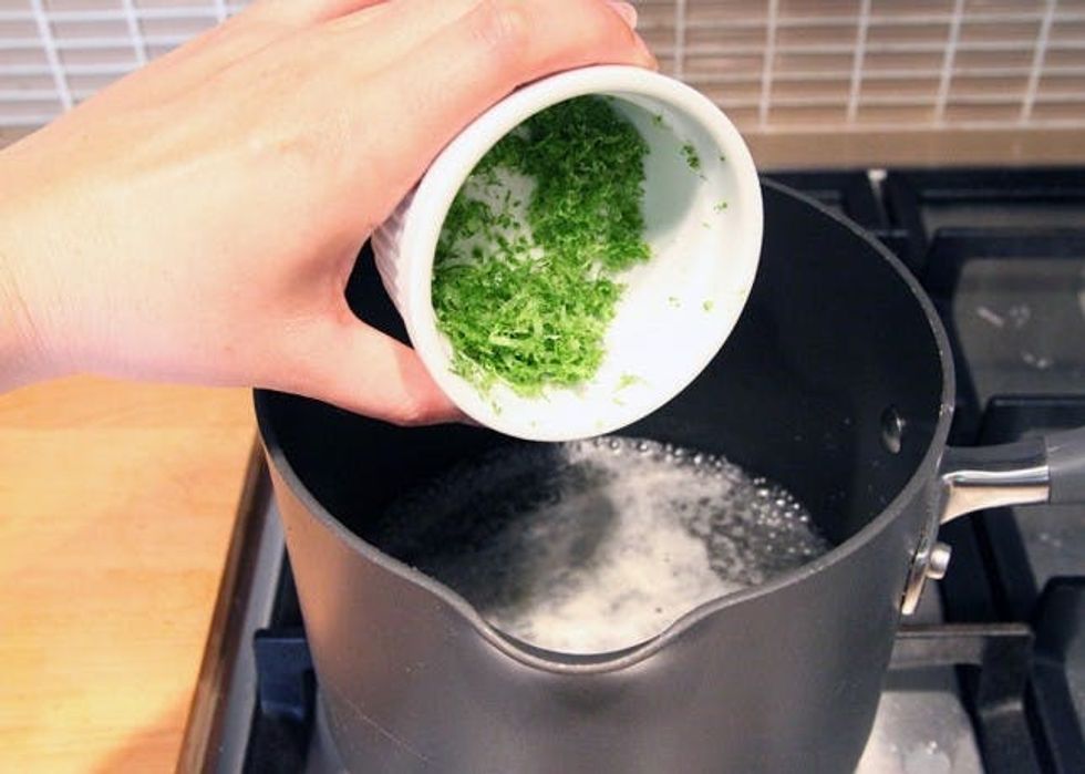 1. Place water, sugar, lime juice, and lime zest in a medium sauce pan. Heat on medium-high, until sugar dissolves and mixture begins to gently boil. Reduce heat, and simmer for about 8-10 minutes. Cool completely before using.