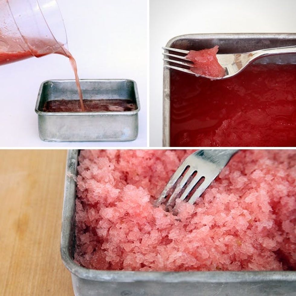Pour mixture in a square, shallow baking pan and place in the freezer. After about 45-60 min, use a fork to scrape the frozen bits into the center of the pan to combine.