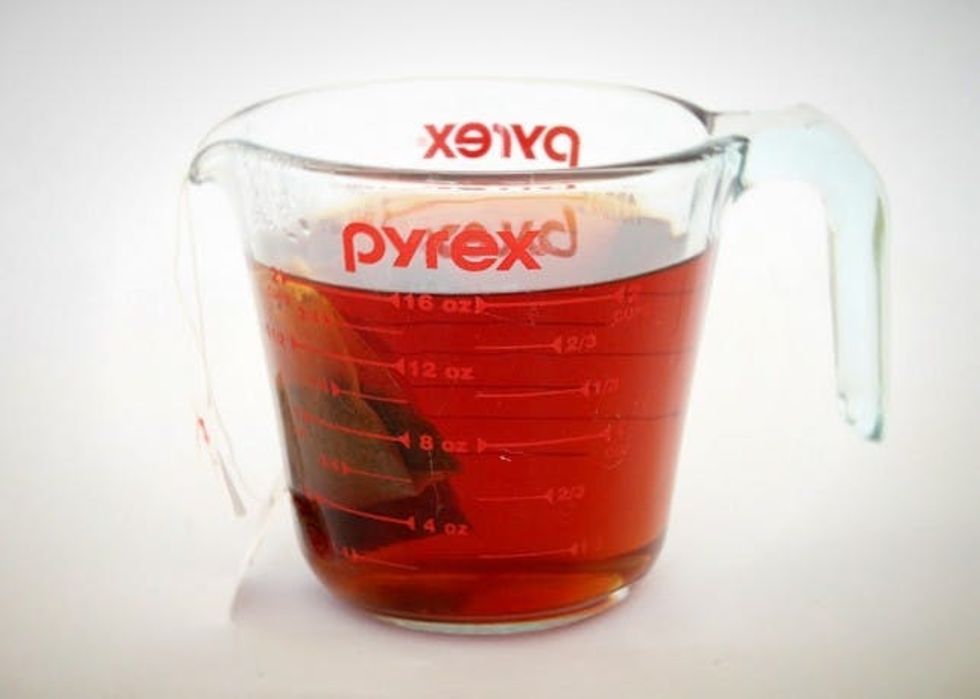 1. In a medium saucepan, bring 2 cups water to a boil. Once the water begins to boil, remove it from the heat. Add in the 2 black tea bags and steep for about 5-8 minutes. Once cool, remove the tea bags and discard.