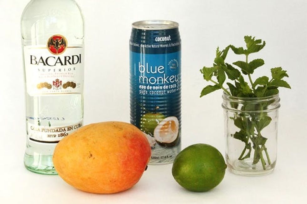 Measure and add white rum, coconut water, lime juice, and mint simple syrup to the blender with the mango puree. Blend to combine.