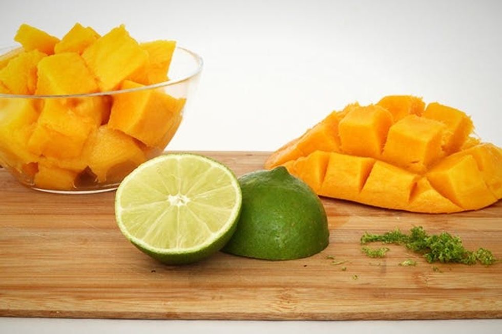 Slice mango and puree in a blender, or use store-bought mango juice or nectar. You will need about 2 mangos to produce 1 cup of puree.