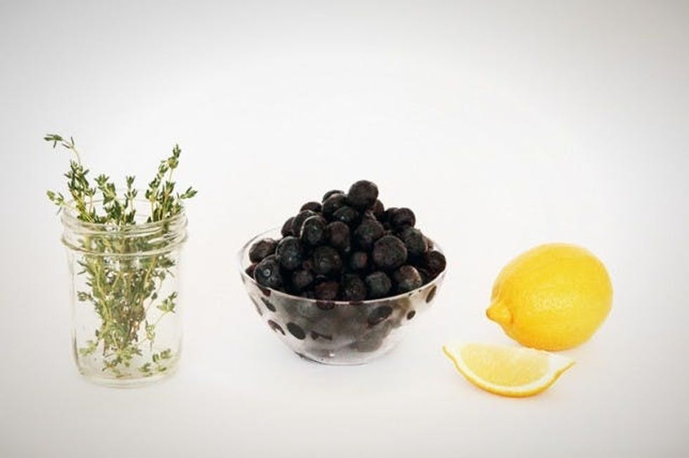 4. Once cooled, pour the lemon-thyme syrup into the blender with the pureed blueberries. Blend to combine