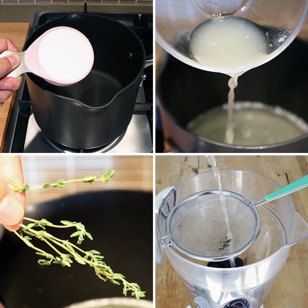 2. Add water and sugar to a medium sauce pan and place over medium-high heat. Bring to a boil and simmer until sugar dissolves. Remove from heat and stir in lemon juice and thyme. Let steep until mixture has cooled.