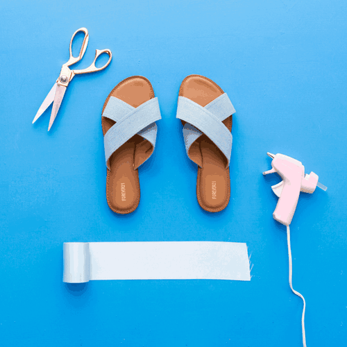 I don’t know about you, but I’m REALLY feeling the mellow yellow these days. This is probably the easiest DIY of all the sandals hacks. All you need is some ruffled trim, scissors, and a hot glue gun.