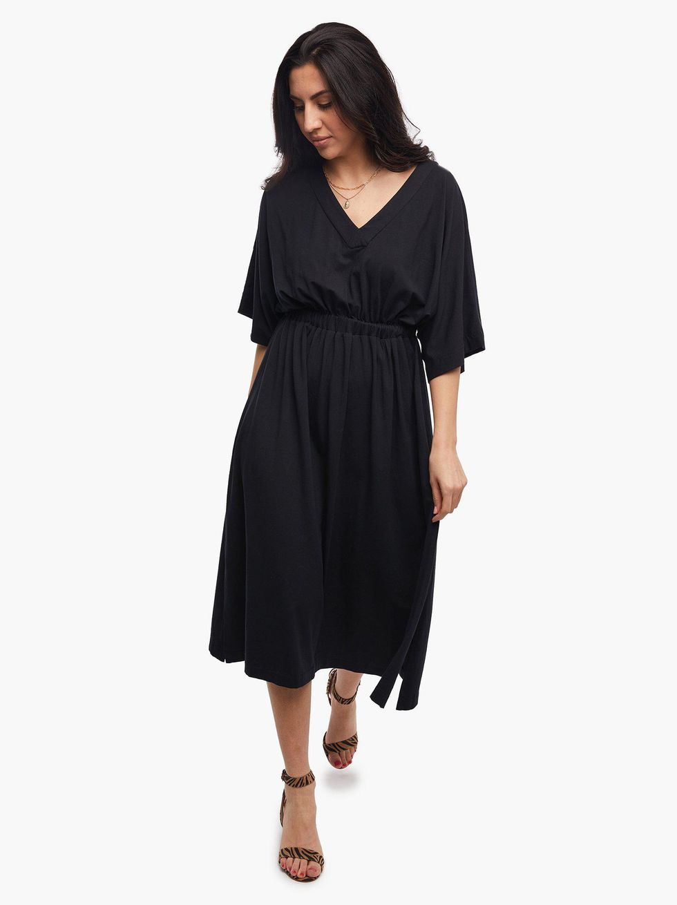 Classic black goes a long way with the right accessories. This NYC-made dress in soft tencel fabric can go from wedding to weekend all summer long.