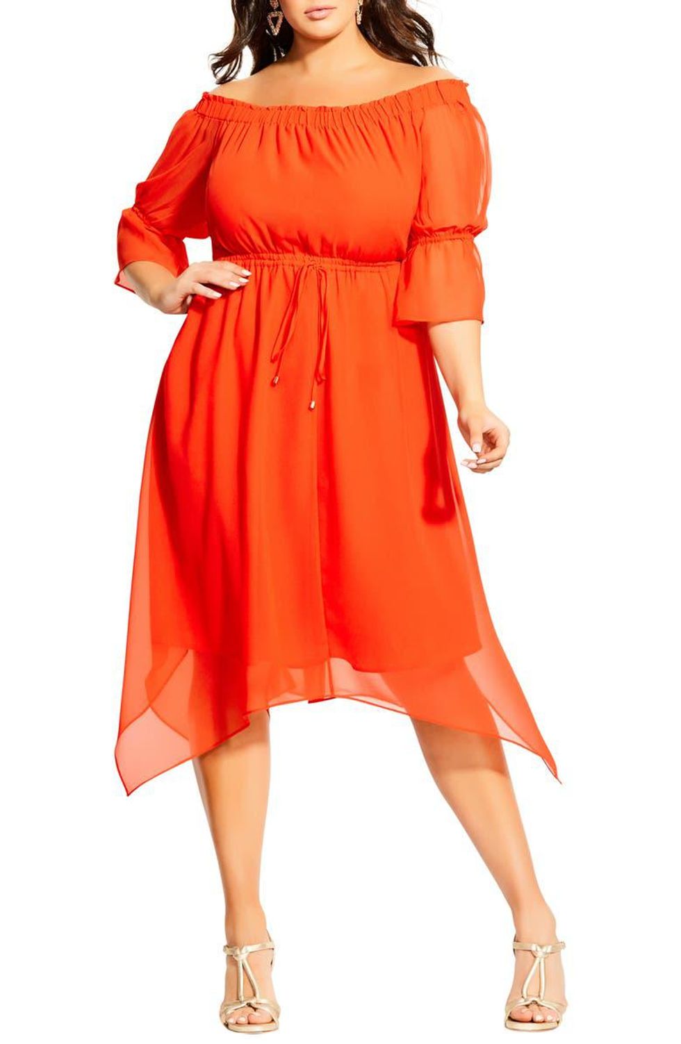 City Chic Reflections Off the Shoulder Handkerchief Hem Dress ($119)