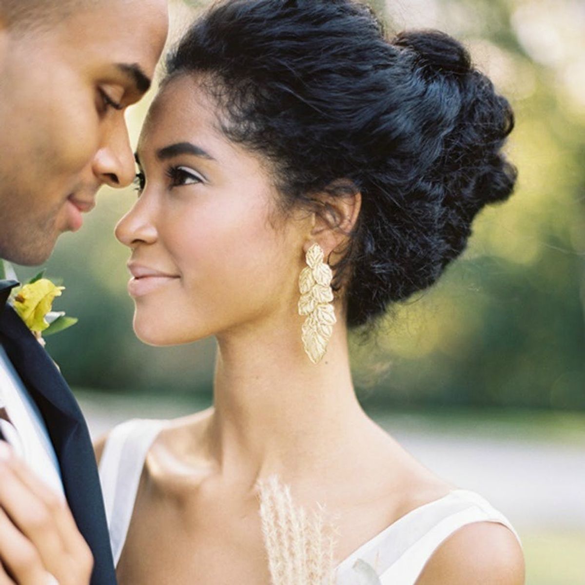 8. Regal Tie-Back: Work the aisle like a goddess by pulling thick hair back into a regal knot, then dialing up the drama with a pair of shimmering gold earrings. (via Joey Kennedy)