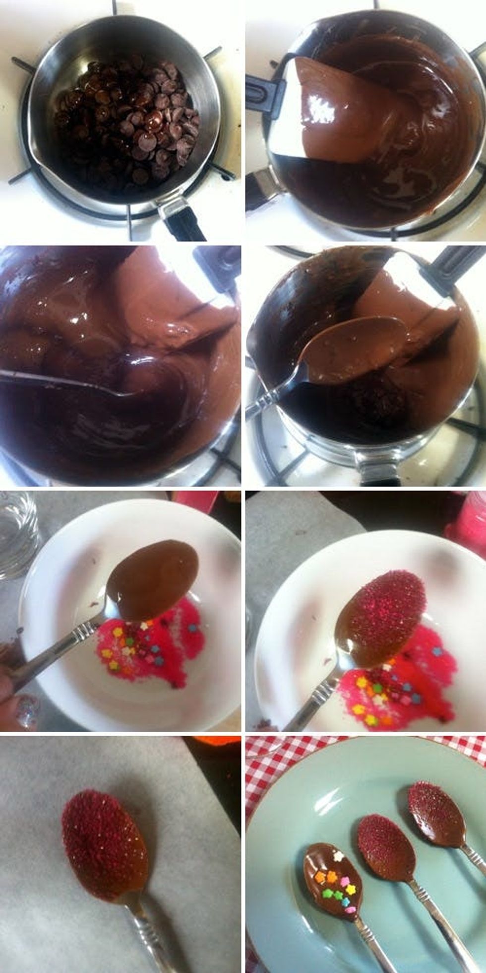 Dip your spoon in, shake off excess chocolate (the spoon should not be dripping), add sprinkles (or crushed candy cane, crushed Oreos, etc) and set down on parchment paper to cool. To speed up the process, you can place them in the fridge or freezer. If you don’t have time for this, use Nutella instead! For our hot chocolate day, we put finished spoons out on a plate but they also make great gifts if you wrap them in parchment paper with a ribbon.