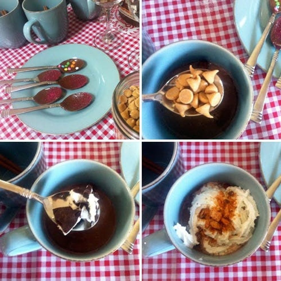 Next, heat up your hot chocolate and set up your hot chocolate bar. When you make your hot chocolate, make it weaker than usual, since you’ll be sweetening it up with a cornucopia of sugary goodness.