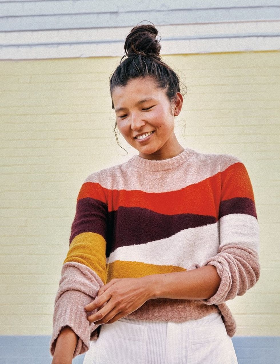Faherty is donating 10 percent of all sales, including this intarsia landscape cotton-cashmere sweater, to the non-profit IllumiNative today in honor of Indigenous Peoples Day.