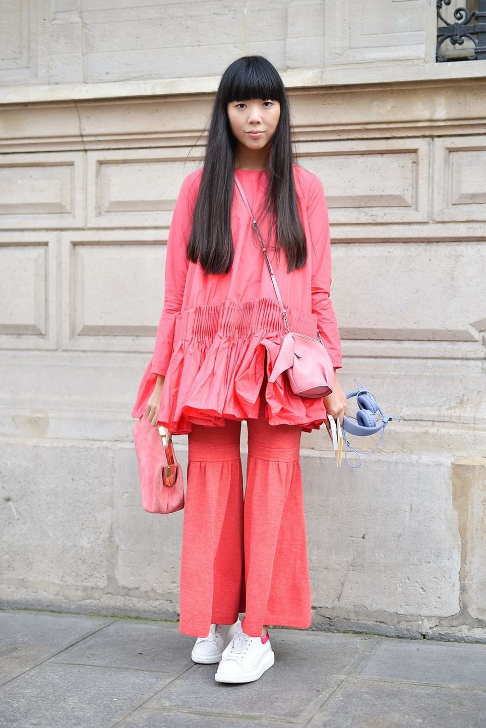 7. Rock head-to-toe monochrome. Got color? From her voluminous top to her petite Loewe elephant purse and Alexander McQueen trainers, Lau’s a vision in tonal shades of bright fuchsia. (Photo via Vanni Bassetti/Getty)