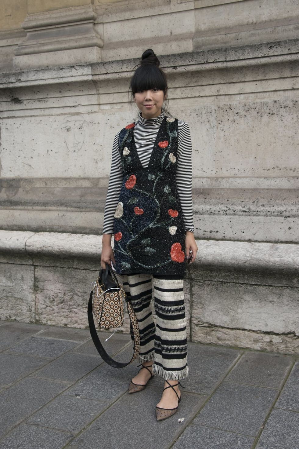 8. Do give the dress-over-pants look a go. This off-beat Style Bubble-approved outfit can best be described as uniquely British (and perhaps, a bit Alexa Chung). She breathes new life into a sequin heart-embellished dress from Ganni by layering it over a striped turtleneck and frayed hem pants for a little #OOTD magic. (Photo via Kirstin Sinclair/Getty)