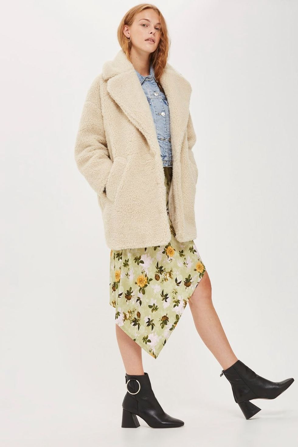 A Cocoon Coat for a Denim Jacket: Mark our words: It won't be long now before a '70s-esque cocoon coat is in heavy rotation. This textured teddy bear topper is begging to be teamed with a dark floral skirt and combat boots for a getup that reads grunge 2.0. Brit + Co Pick: Topshop Borg Cocoon Coat ($150)